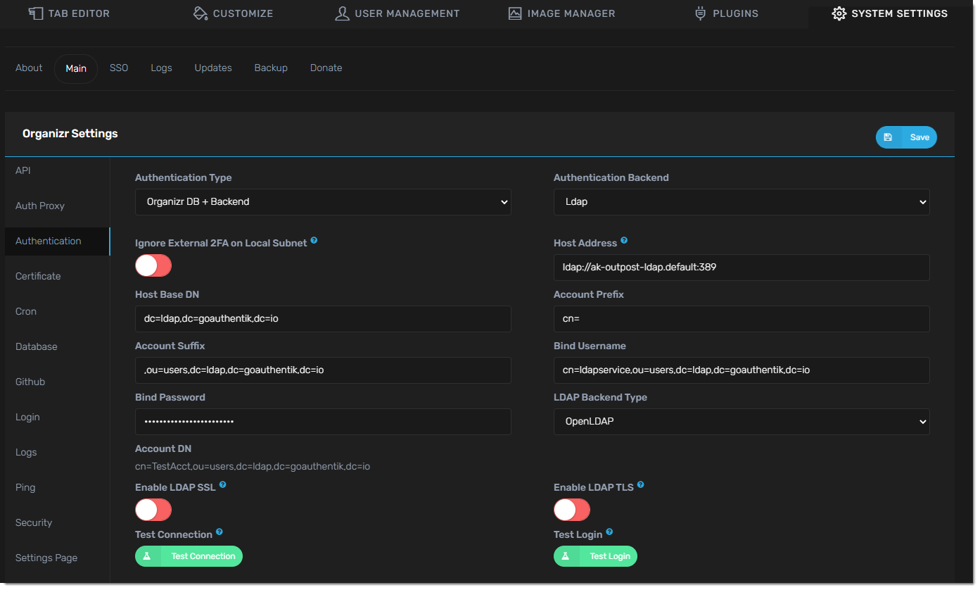 - Setup Authentication in organizr system settings -> main -> Authentication